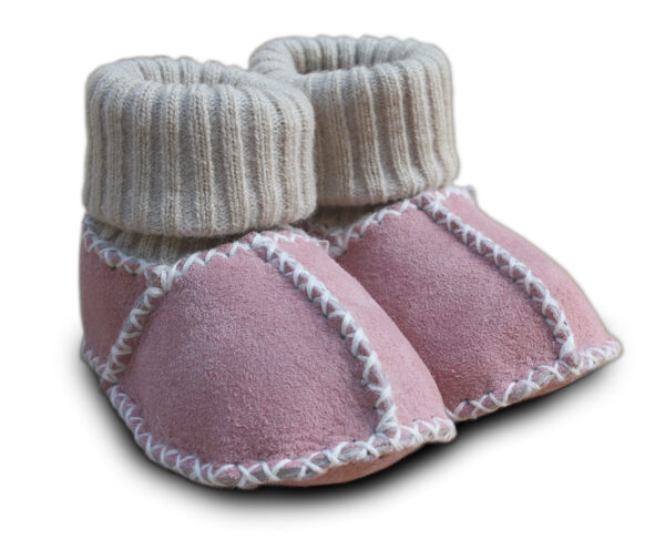 Babylammfellschuh Mod. Söcken Strick. Handgenähtes Qualitätsprodukt. Ohne feste Sohle, mit Strickbündchen, Außenmaterial Rindervelourspaltleder, Innenmaterial gewachsenes Lammfell, erhältlich in den Doppelgrößen 16/17, 18/19, 20/21, 22/23 und in den Farbvarianten blau, camel, rose, sand. Geeignet für Babys im Alter von 0-ca.1,5 Jahren