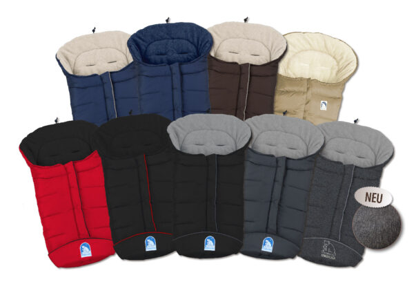 Zum Schluß nochmal einer ohne Lammfell. Winterfußsack Eisbär, wind – und wasserabweisender Außenstoff, innen weicher kuscheliger Fleece, kann im Kopfbereich zur Mumienform zusammengezogen werden. Rutschhemmende Rückseite, komplett warm wattiert. Durch die verdeckten Reißverschlussleisten bzw. die 3 verdeckten Reißverschlüsse kann der Winterfußsack wie der Lammfellfußsack Premium zu einer großen weichen Liegefläche aufgeklappt werden. Die Größe des Winterfußsackes beträgt 98x47cm. Er ist erhältlich in den Farbkombinationen Außen/innen: marineblau/marineblau, marineblau/sand, moccabraun/sand, beige/sand, rot/schwarz, schwarz/schwarz, schwarz/grau, grau/grau und graumeliert/grau